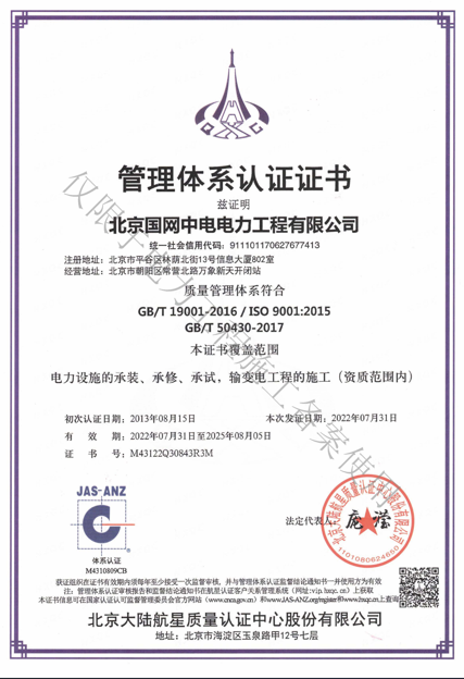 北京國網中電電力工程有限公司,已取得國家電監(jiān)會頒發(fā)的《承裝(修、試)電力設施許可證》、為電力施工承裝四級、承修四級、承試四級企業(yè)。北京市住房和城鄉(xiāng)建設委員會頒發(fā)的房屋建筑施工總承包二級、機電設備安裝工程專業(yè)承包二級、輸變電專業(yè)承包二級、城市及道路照明工程專業(yè)承包二級、市政公用工程總承包二級資質、勞務不分等級,已通過ISO9001:2015 GB/T50430-2017質量管理體系、GB/T24001-2016/ISO 14001:2015環(huán)境管理體系、